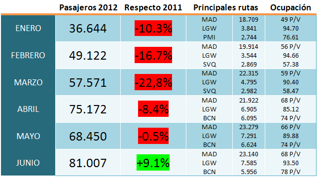 Os dejamos unas tablas con los datos mensuales y totales de 2012. Los datos en ocupación: P/V = Pasajeros por vuelo, 94.70 sería dato de ocupación porcentual. MAD (Madrid – Barajas), LGW (Londres Gatwick), PMI (Palma), SVQ (Sevilla), BCN (Barcelona), STN (Londres Stansted).