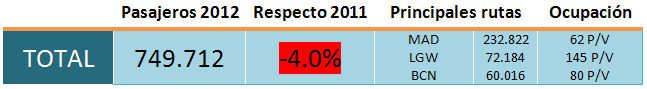 Lo que parecía la salida de una caída permanente desde 2008 nos abandonaba en octubre. Nueva pérdida de un 14.1%. La salida de Ryanair en la ruta a Madrid colaboró a ello, 8.708 pasajeros menos volaron en esa línea respecto a octubre de 2011. Bien es cierto que parte de las aerolíneas «veraniegas» nos dejan a lo largo de septiembre, y finalmente todas cierran sus rutas a finales de octubre. Así pues, unos datos tan perjudicados deberían haber llegado un mes más tarde.
