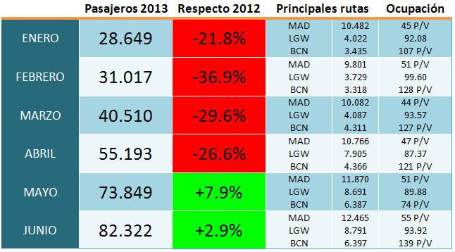 La salida de Ryanair de la ruta a Madrid es la protagonista. En enero de 2012 transportó a 6.247 viajeros, en febrero a 6.661, en marzo a 7.701, en abril a 8.519, en mayo a 9.387 y en junio a 9.306. Cada mes es la causante de la disminución de, mínimo, un tercio de los usuarios con la mayor coincidencia en enero.