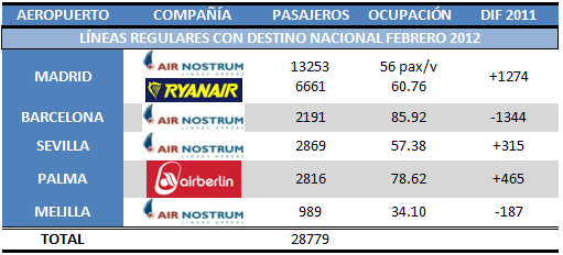 Titular majo, ¿eh? Este mes tenemos una alegría. Sólo una: ¡no somos el aeropuerto de Andalucía con menos pasajeros en febrero! Sino que cedemos el dudoso honor al de Jerez y Almería escala un puesto hasta situarse en el cuarto puesto. Un total de 49.122 pasajeros pasaron por las instalaciones durante el mes de febrero, siendo al día 1.694 usuarios. El dato preocupante vuelve a estar en la bajada de pasajeros respecto a 2011, que es de 16.7%. Las operaciones fueron 997, un 18.1% menos. Otros aeropuertos tienen la excusa de Spanair… nosotros tendremos que echársela a la crisis aunque quizás se nos pueda empezar a tachar de «pesados» y «poco originales».