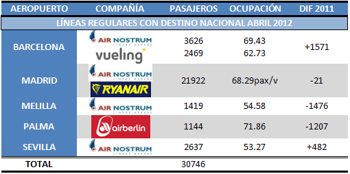 En cuanto a carga, este mes Almería toma las riendas. Moviliza 2.896kg, un 1634.1% más que en abril de 2011.