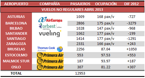 En cuanto a ocupaciones en las rutas de abril, destacar la bajada de Easy Jet. La compañía británica rompe la barrera del 90% y se queda en el 87.37%, quizás por la poca antelación con la que amplió su frecuencia semanal de los jueves. A pesar de ello, son 1.000 pasajeros más (+14.48%) que los que viajaron el año pasado. Las rutas de Ryanair continúan con sus ocupaciones típicas de estos meses mientras que las rutas a Bruselas (Jet Air Fly y Thomas Cook) experimentan una gran subida.