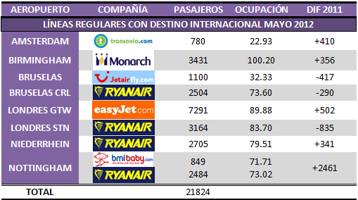 Noticia positiva que todas las rutas nacionales suben en pasajeros. Vueling tras 2 meses operando en Almería va aumentando pasajeros y ocupación y seguramente en verano llegará al 80 %. Además necesita que se aumenten las frecuencias hasta al menos un vuelo diario. Los pasajeros de vuelos fuera de España están cada vez más cerca de los nacionales, y a destacar el aumento de pasajeros en la ruta a Nottingham y el aumento de ocupación de BMI BABY, una pena que sea una compañía condenada a desaparecer en pocos meses.