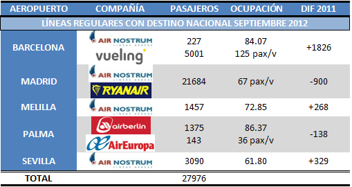 A continuación hacemos un listado con los vuelos y valoración por colores de la utilidad del nuevo servicio de transporte público. (correcto, precaución, muy poco/demasiado tiempo). Los horarios de los vuelos publicados fueron consultados en octubre de 2012. Esta entrada no se modificará con posibles cambios posteriores en los horarios.