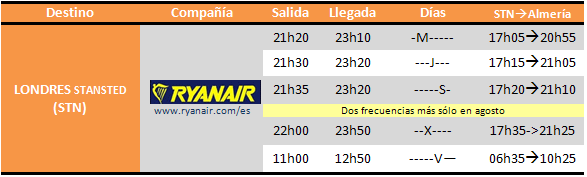 Es sorprendente a la vez que muy interesante saber que Almería está entre los destinos que se mantienen todo el verano. Quizás el volumen de ventas no haya ido tan mal a pesar de la entrada en la ruta de Ryanair, cosa que si se confirma nuestra ruta podría verse fácilmente sustituída por otra aerolínea el verano de 2013. Empresas como Monarch, con la que ya tenemos experiencia en nuestro aeropuerto, ya han anunciado su ampliación en el aeropuerto de East Midlands. Por ahora sólo nos queda esperar los datos de ocupación de la ruta este verano.